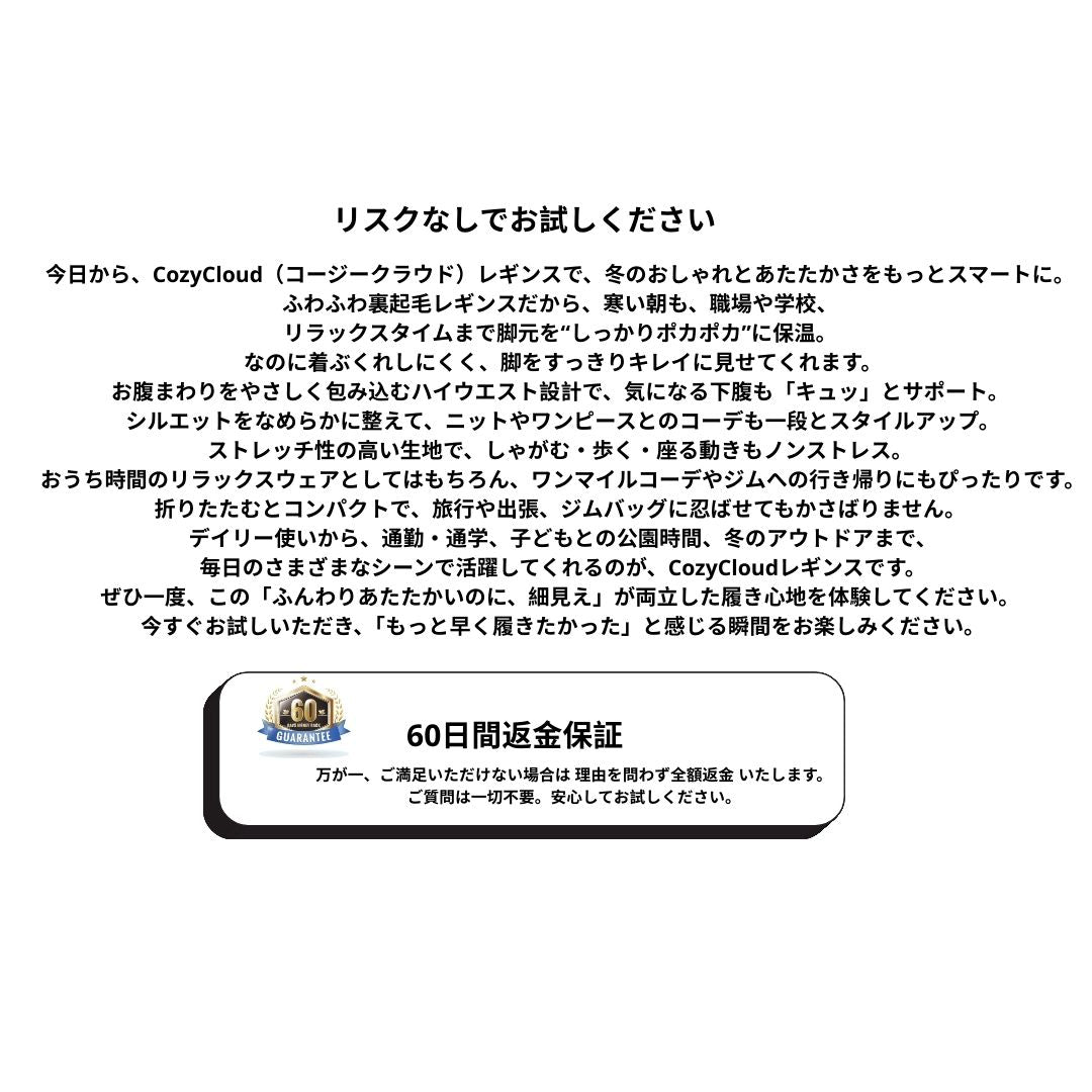 CozyCloudレギンスは、さまざまな体型の方に合うよう、複数のサイズをご用意しています。普段お選びのサイズに合わせてお選びいただけますが、ゆったり履きたい方はワンサイズ上、フィット感を重視される方は通常サイズがおすすめです。